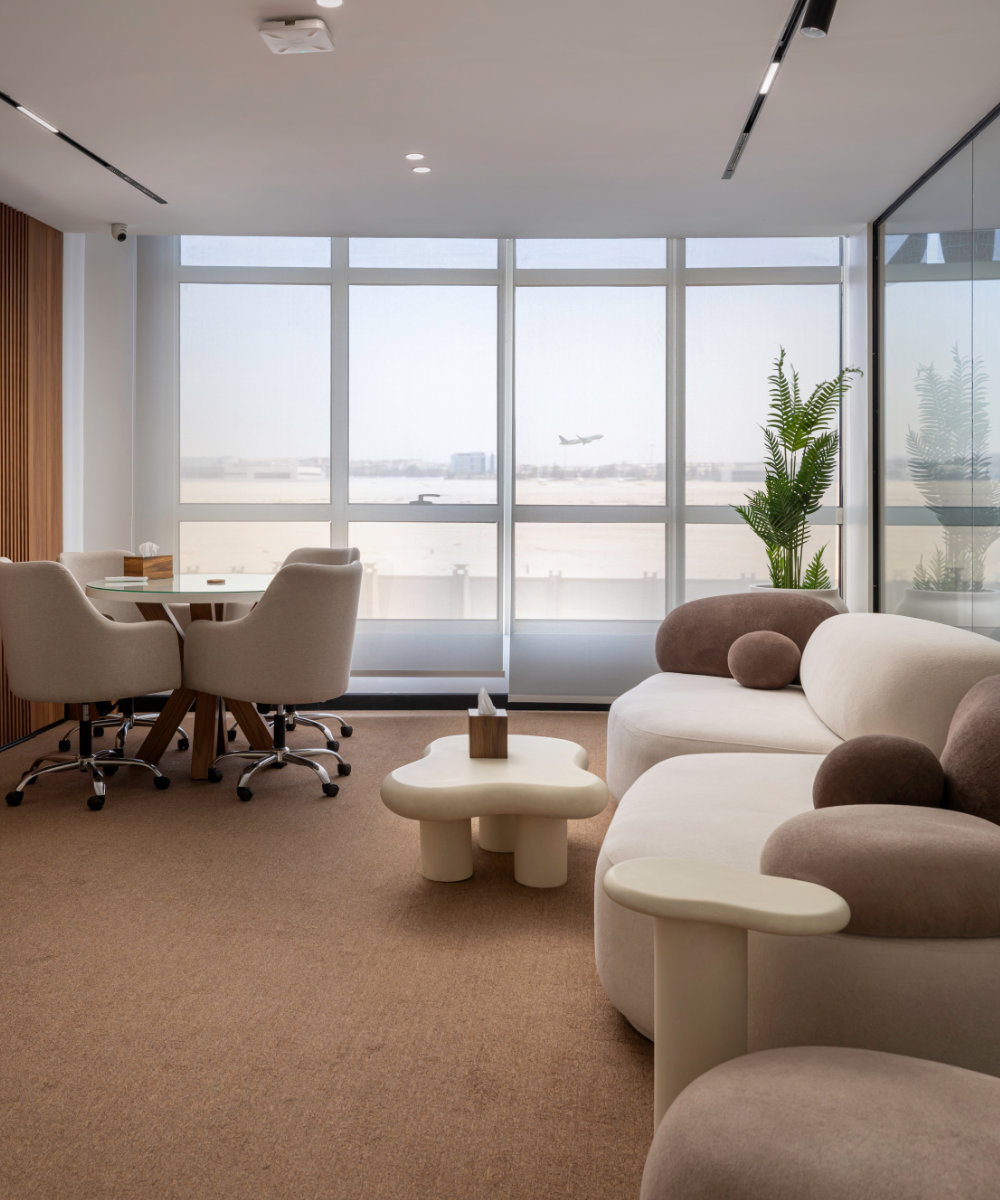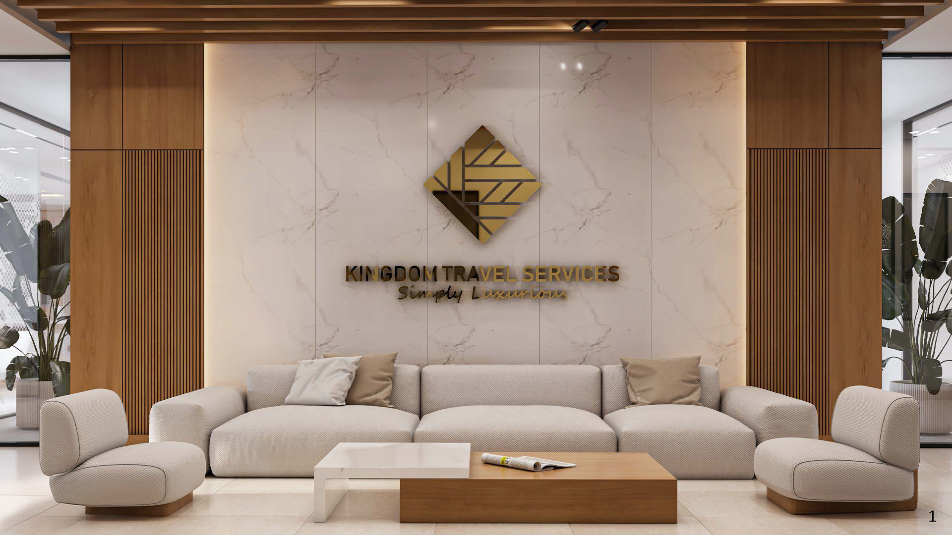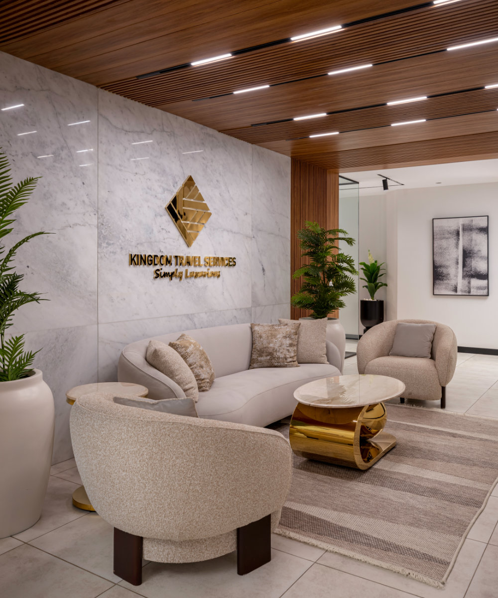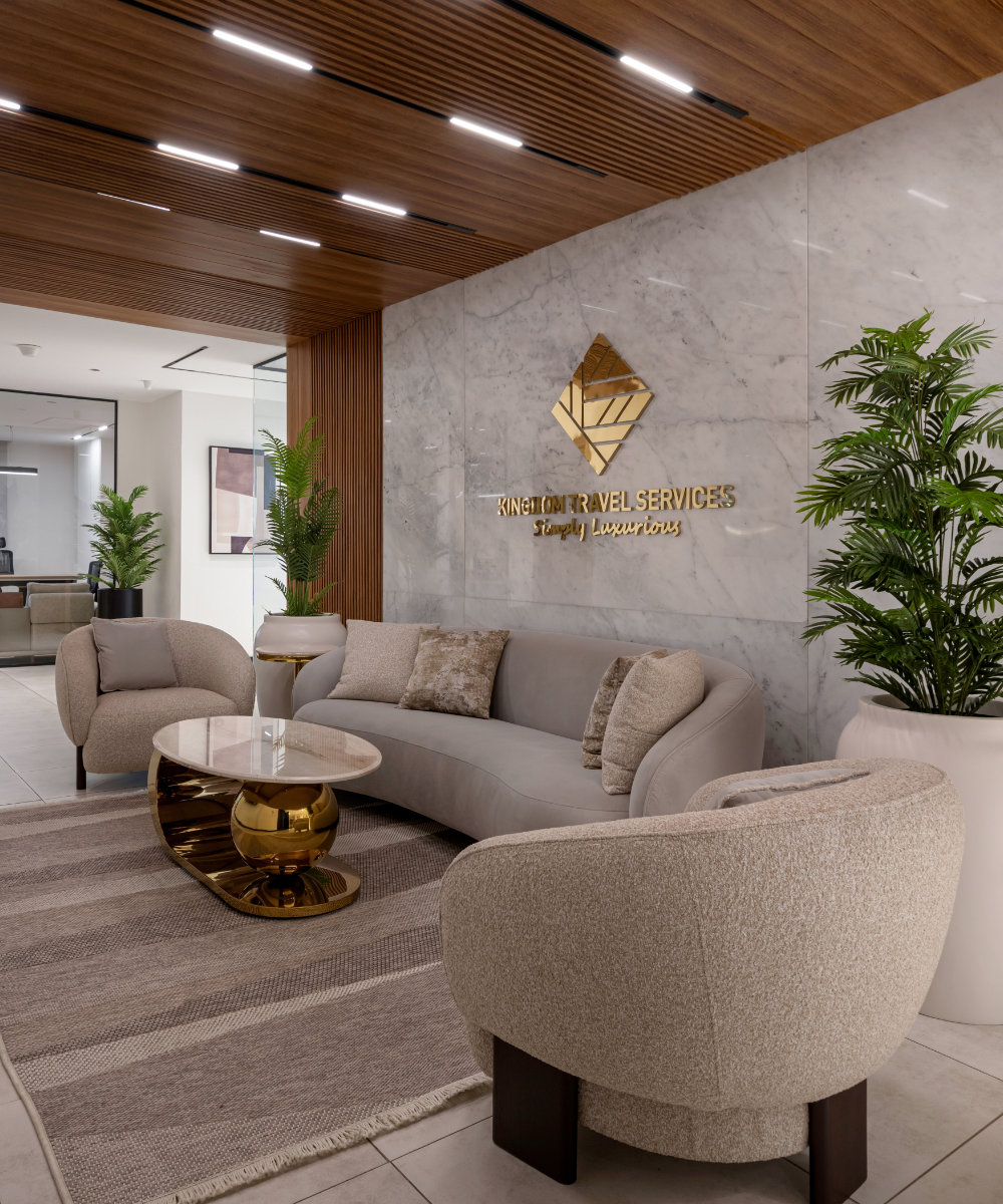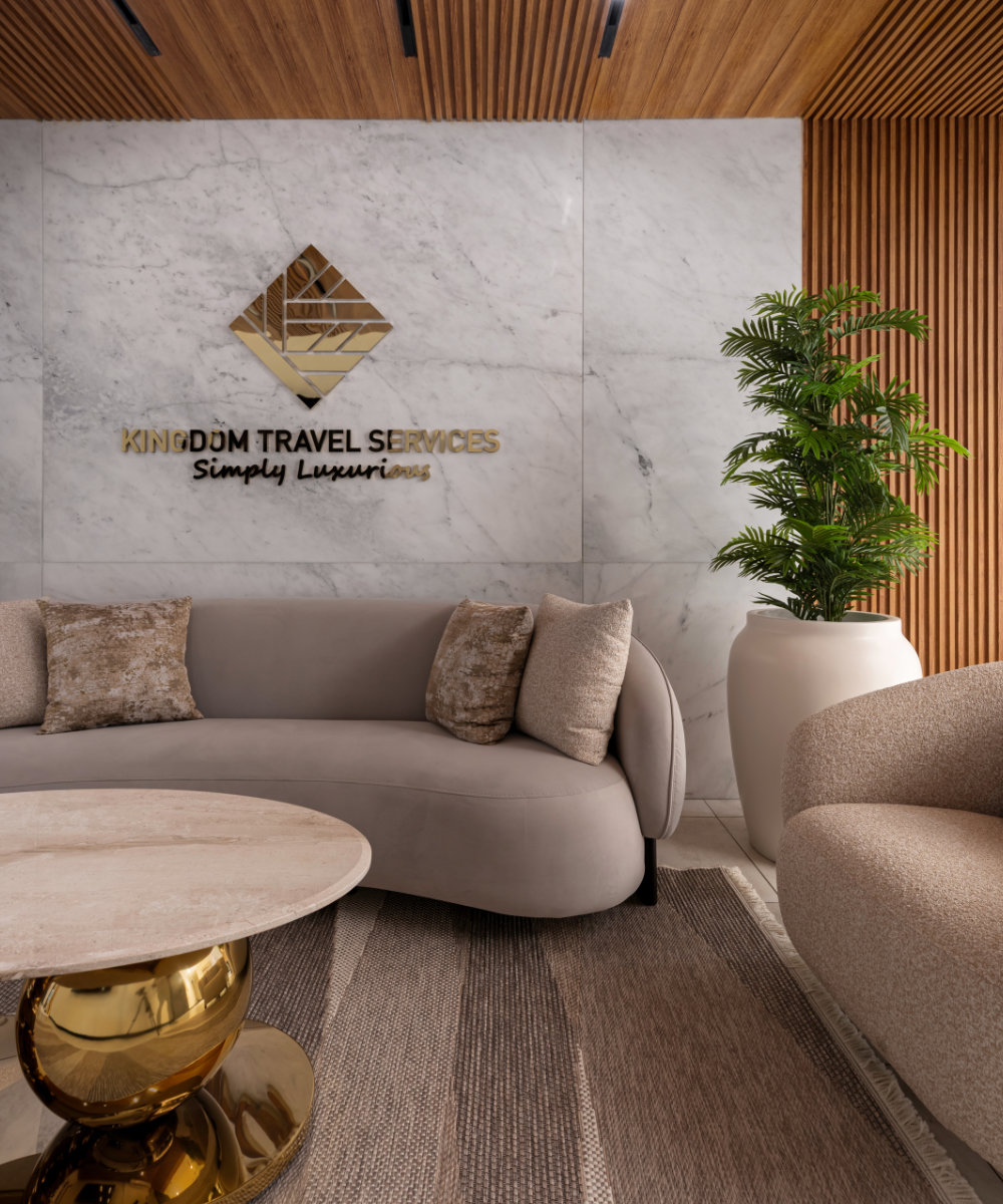 A refined and modern office reception area for "Kingdom Travel Services," featuring a luxurious neutral-toned lounge with comfortable seating, marble and wood finishes, and elegant branding on the wall.