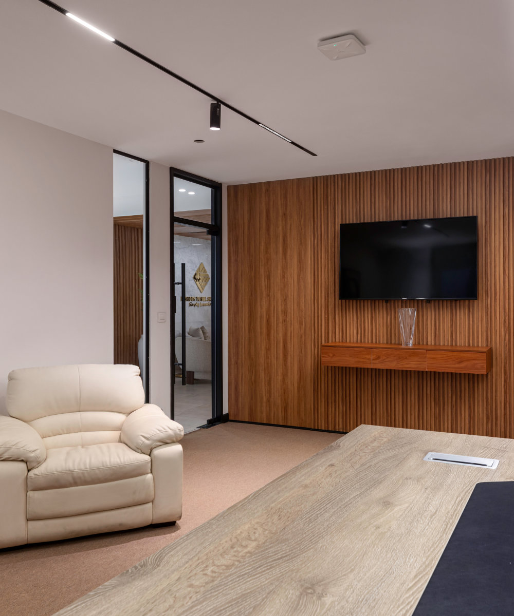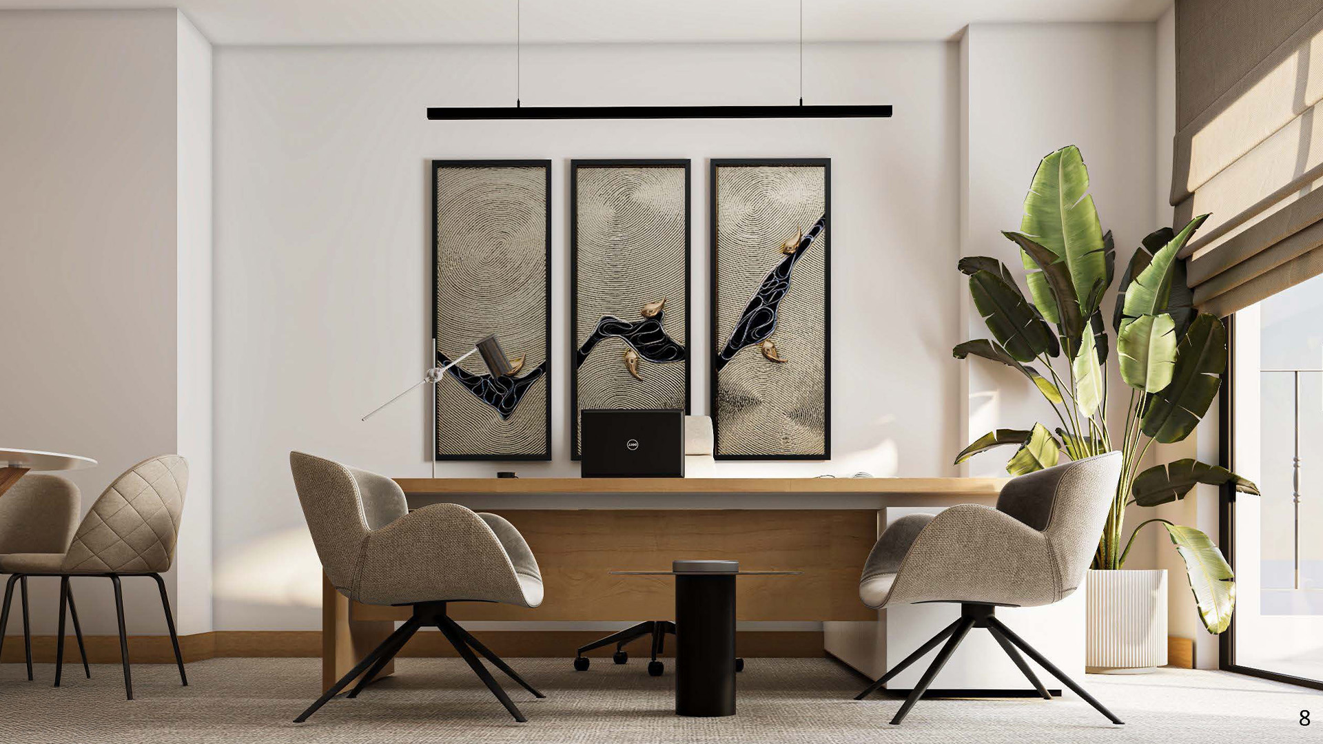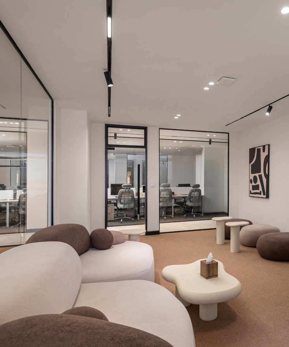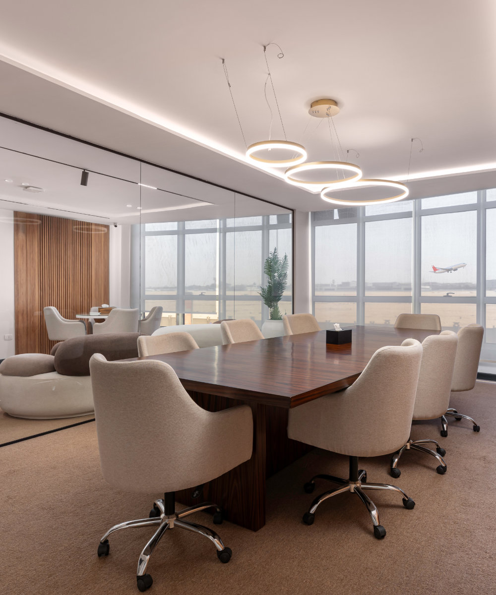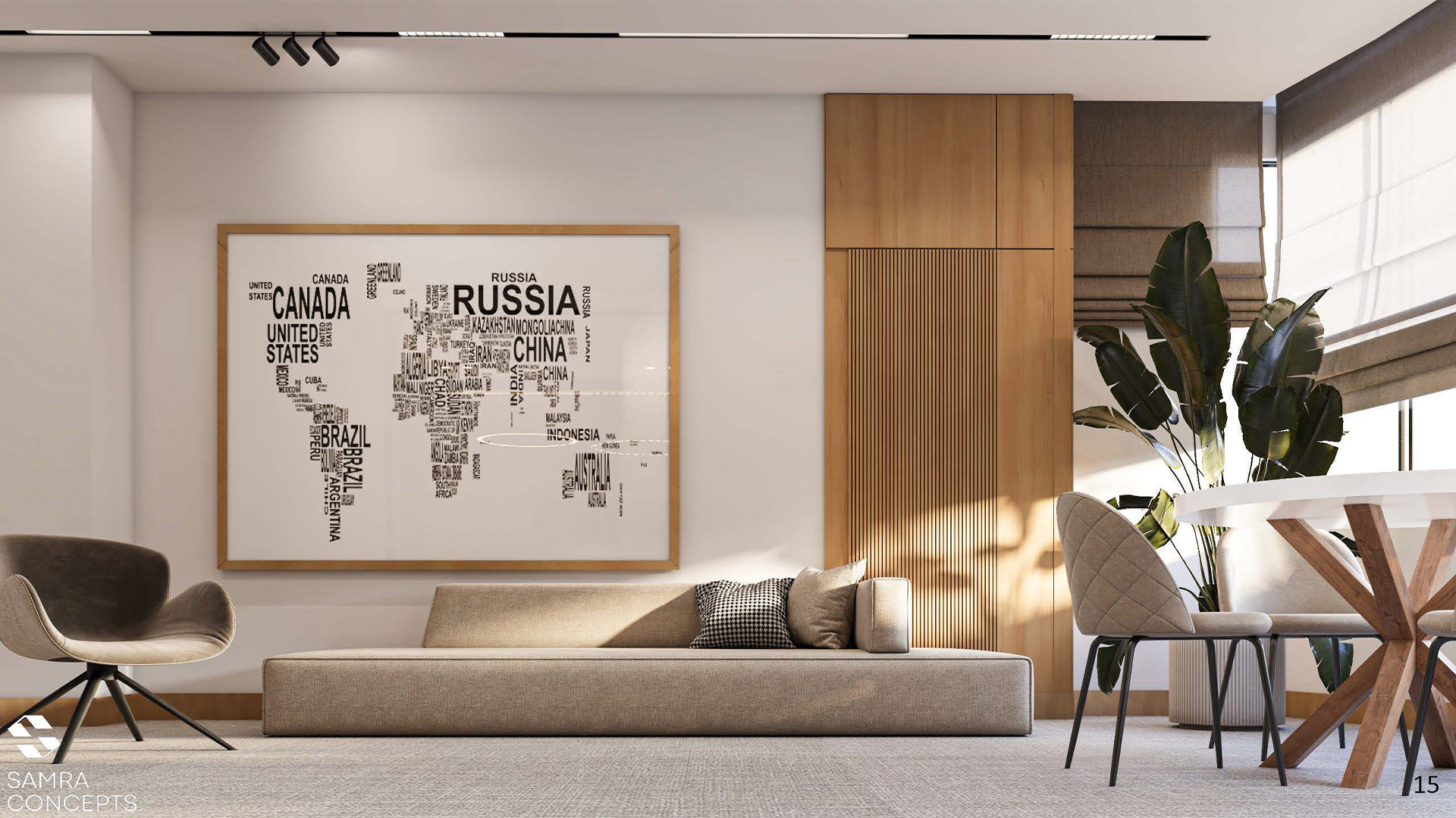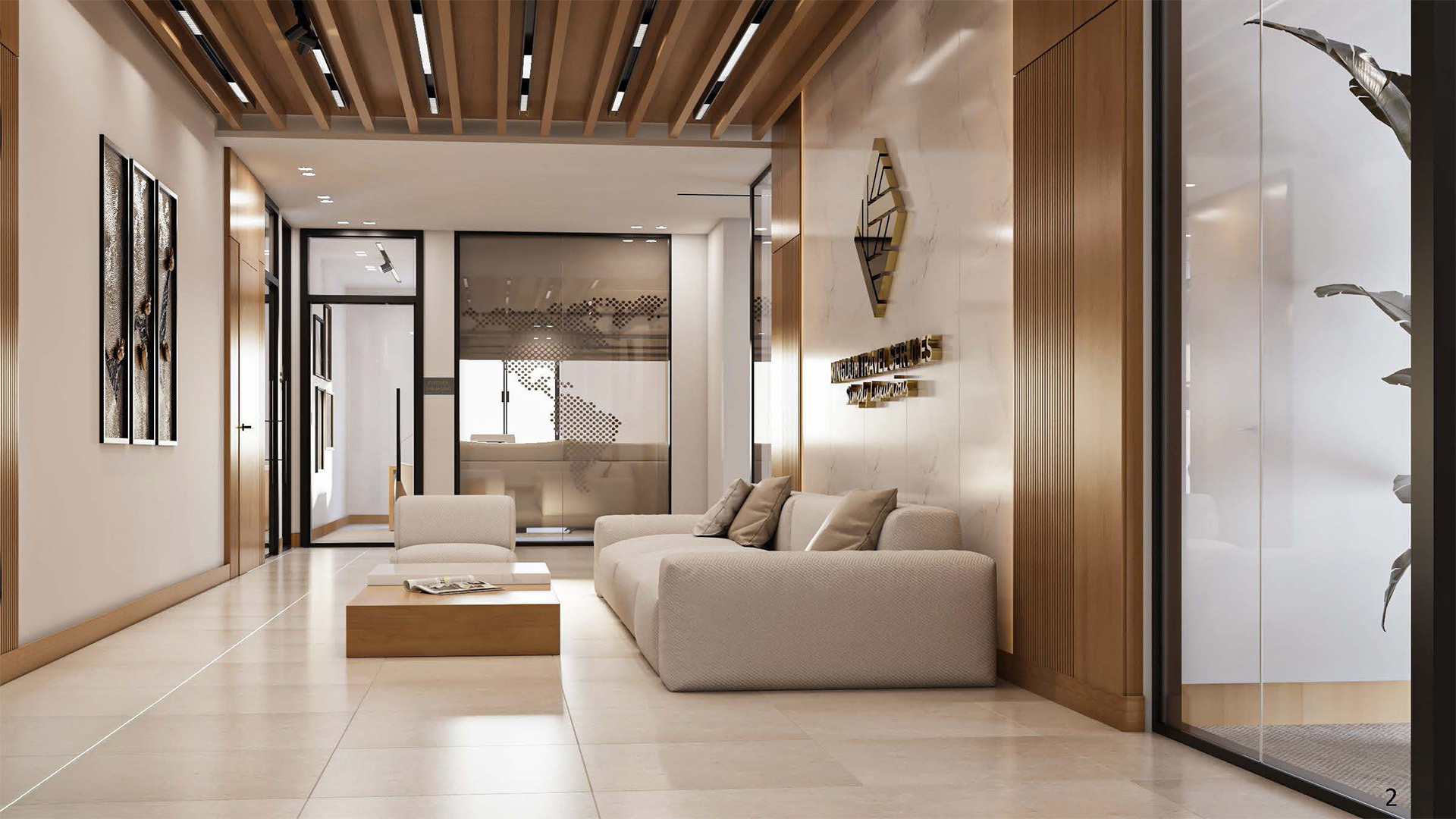 A refined and modern office reception area for "Kingdom Travel Services," featuring a luxurious neutral-toned lounge with comfortable seating, marble and wood finishes, and elegant branding on the wall.