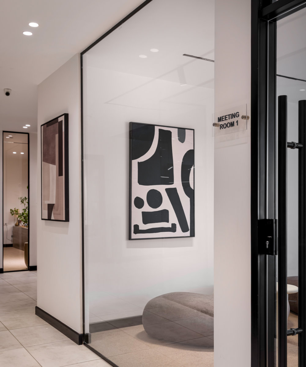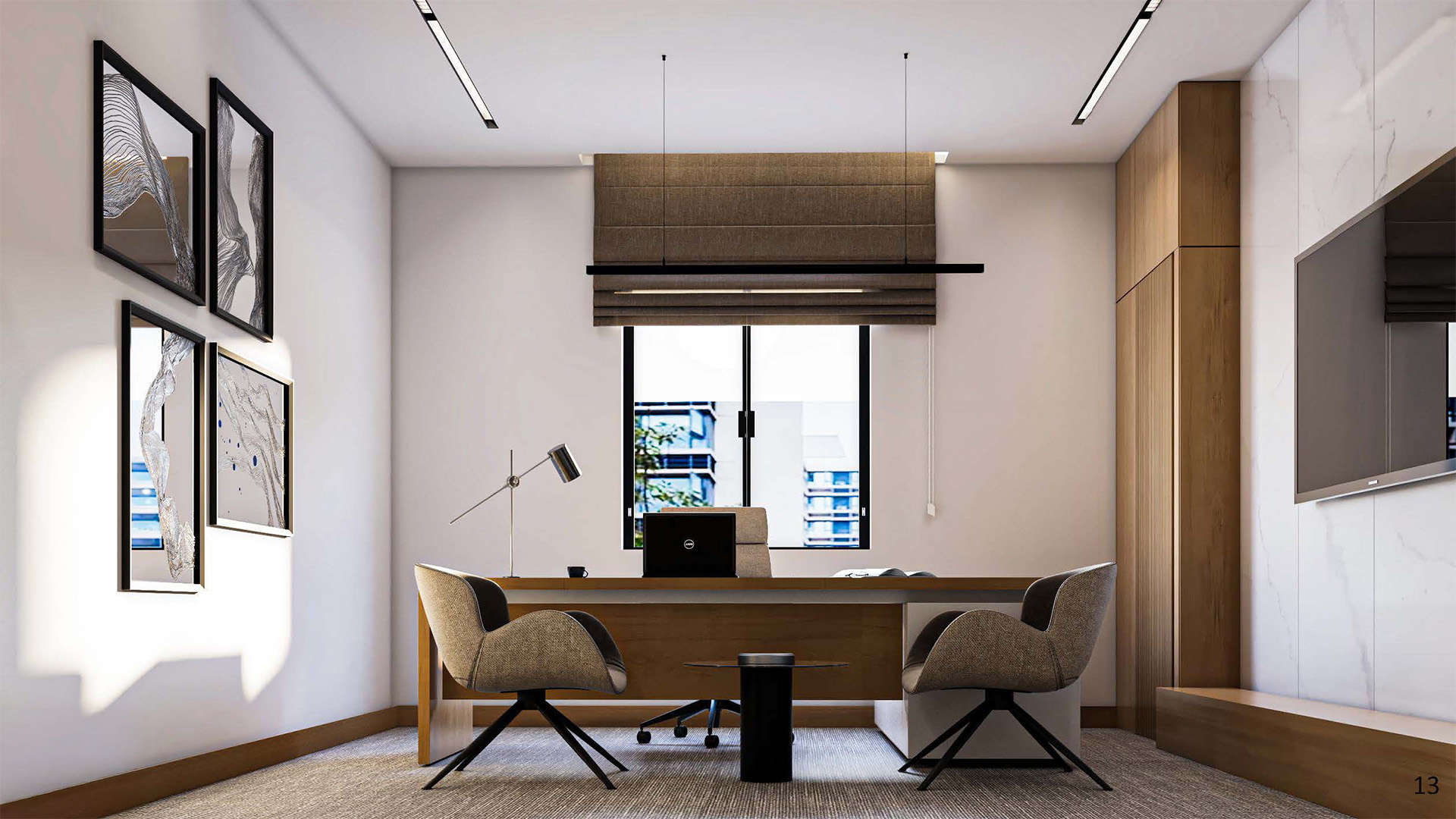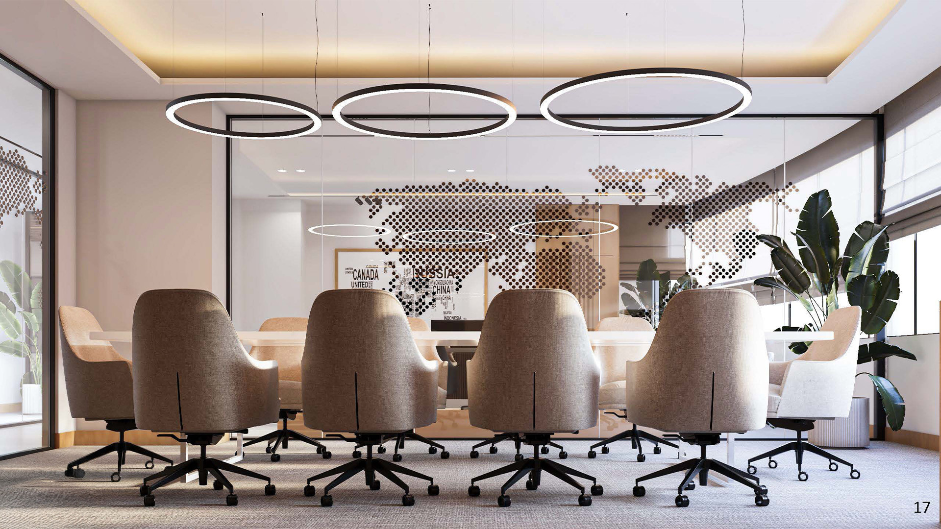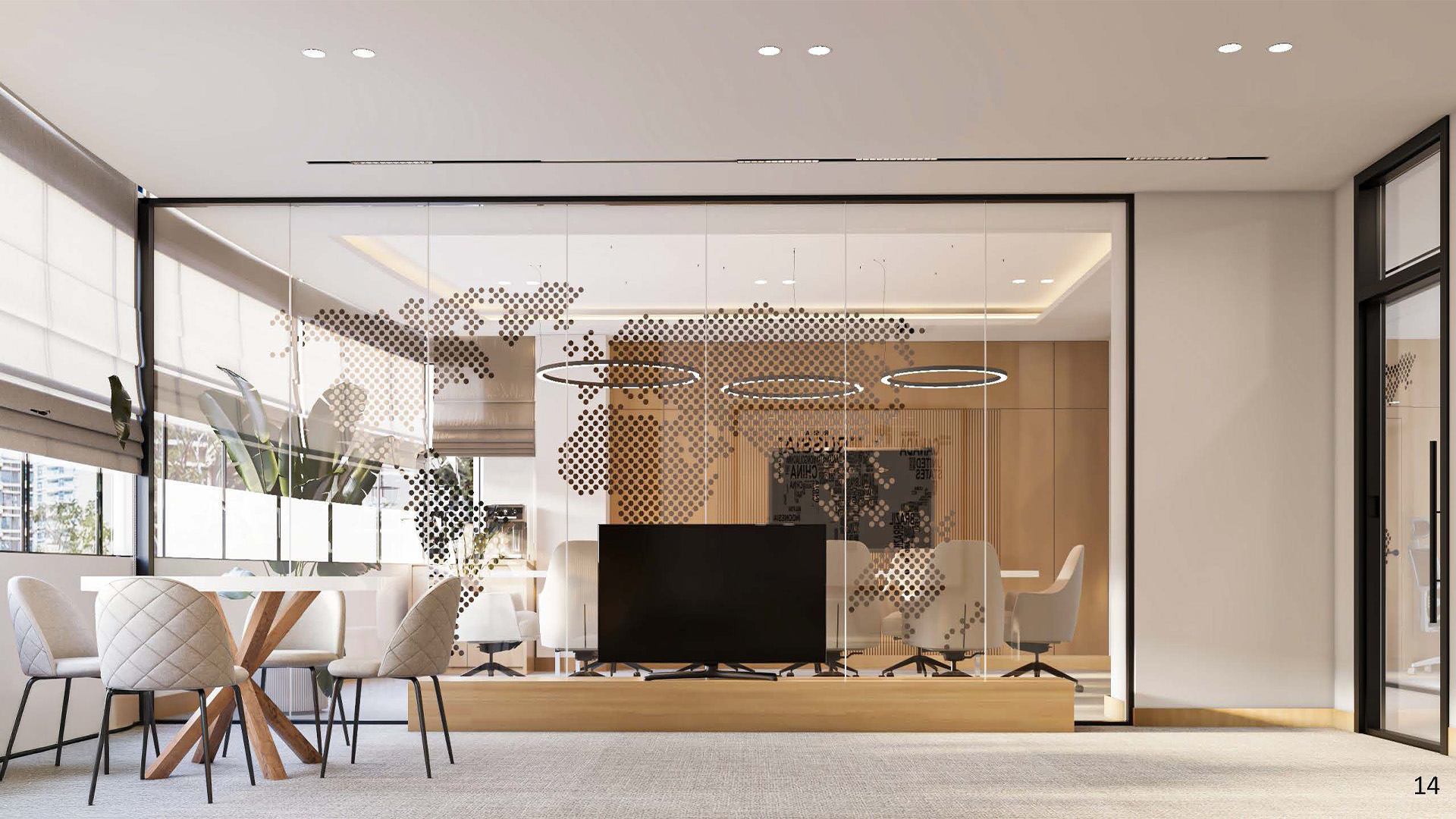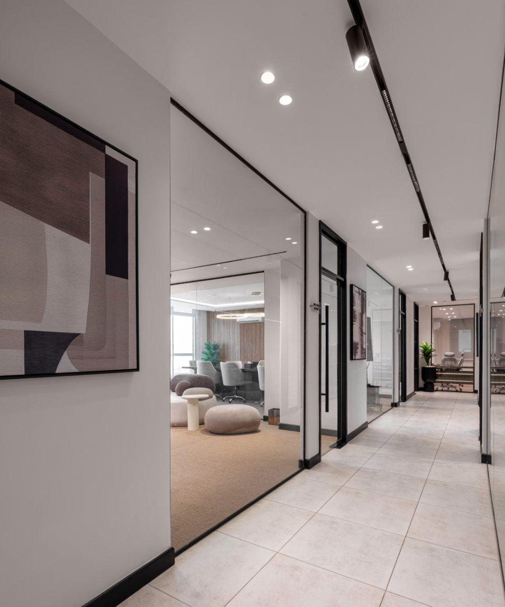 A refined and modern office reception area for "Kingdom Travel Services," featuring a luxurious neutral-toned lounge with comfortable seating, marble and wood finishes, and elegant branding on the wall.