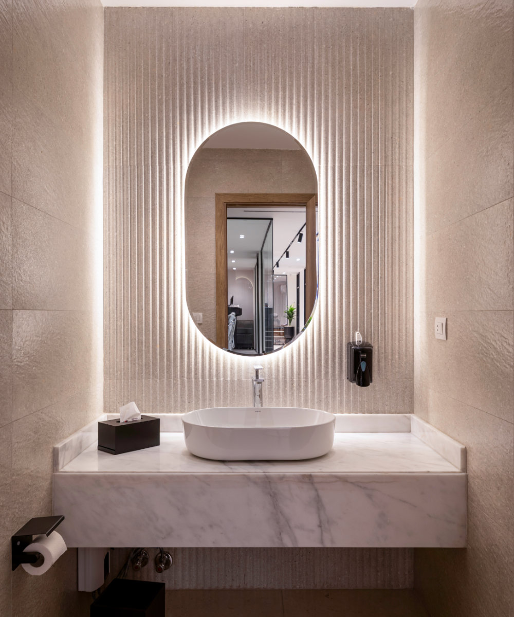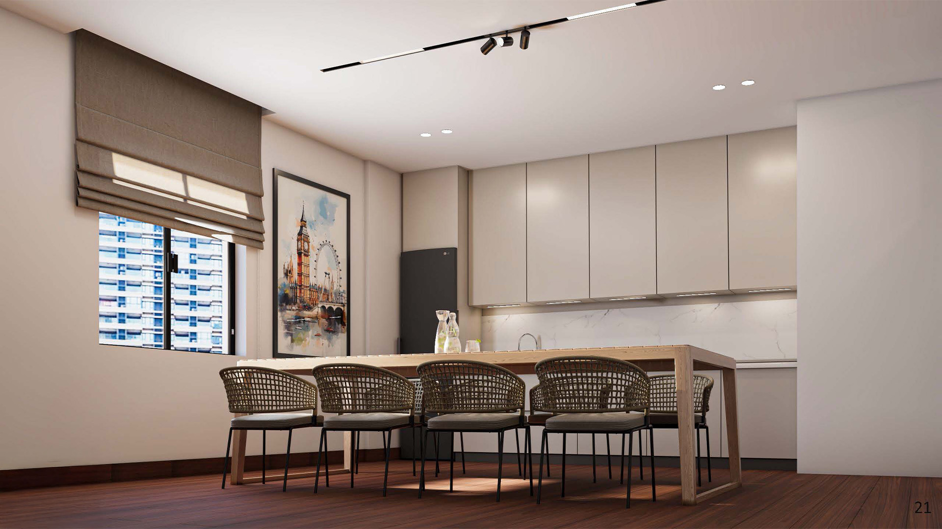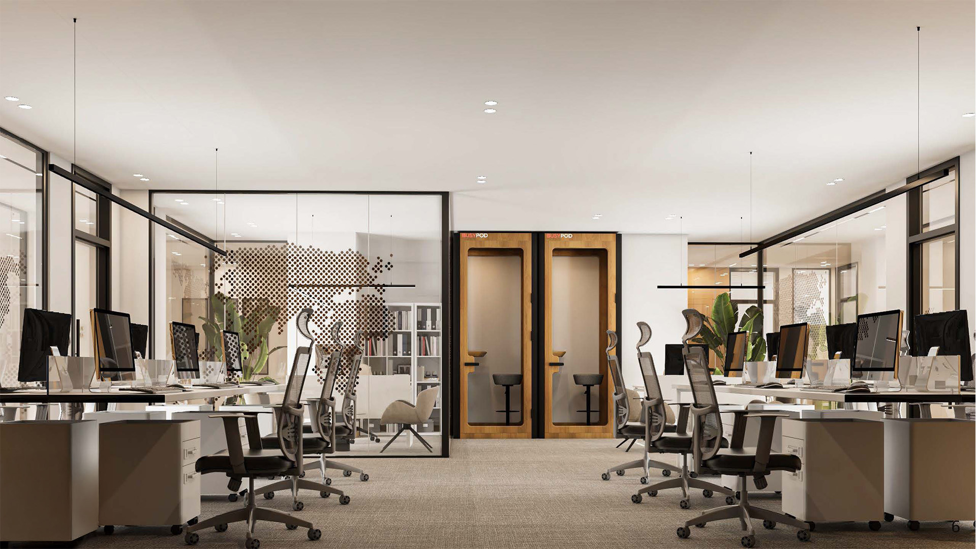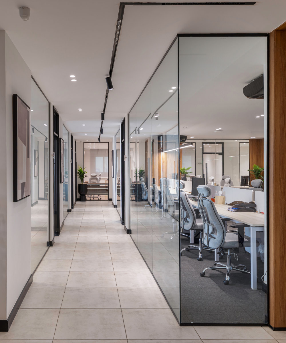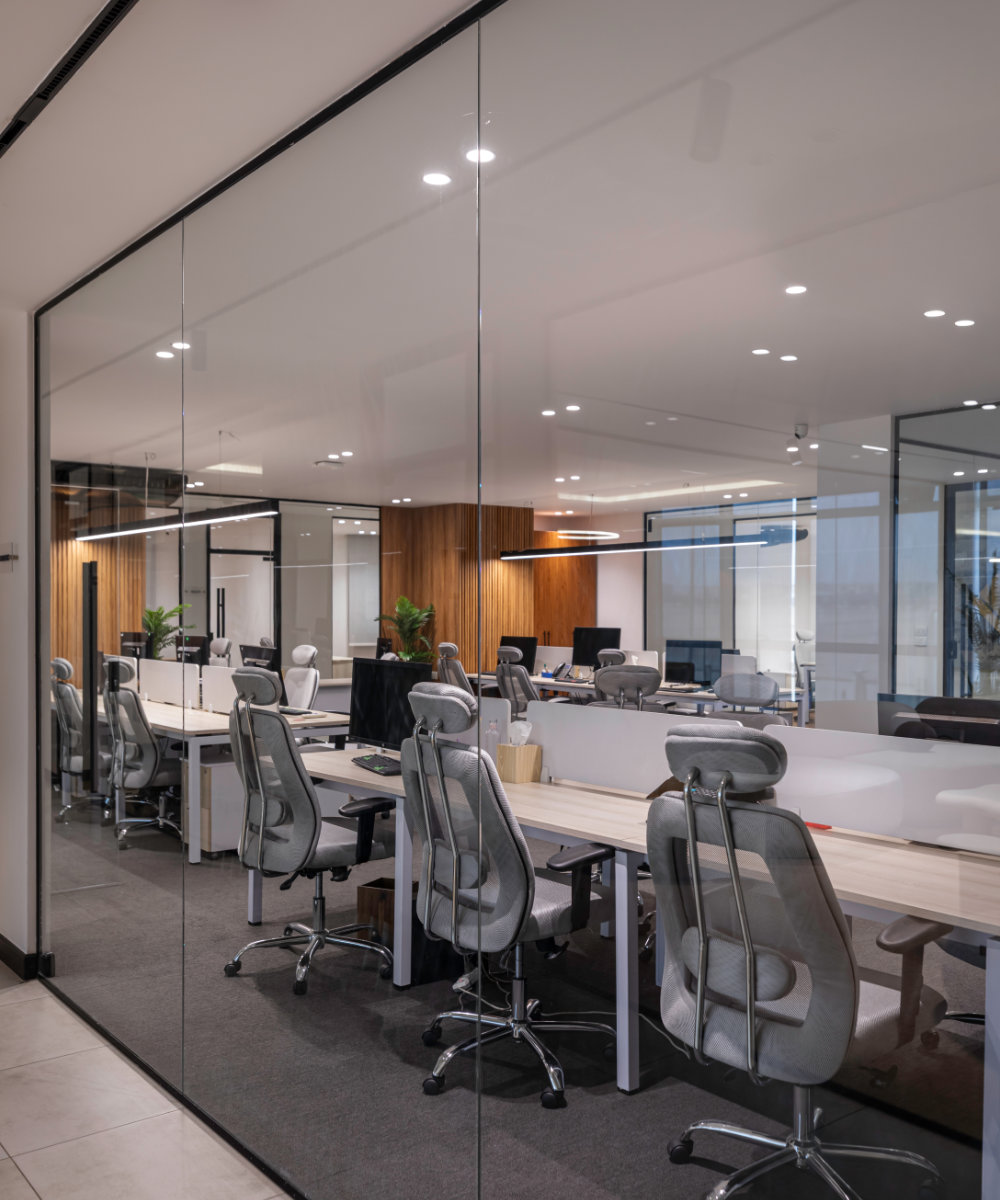 A refined and modern office reception area for "Kingdom Travel Services," featuring a luxurious neutral-toned lounge with comfortable seating, marble and wood finishes, and elegant branding on the wall.