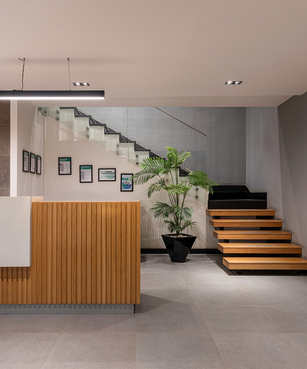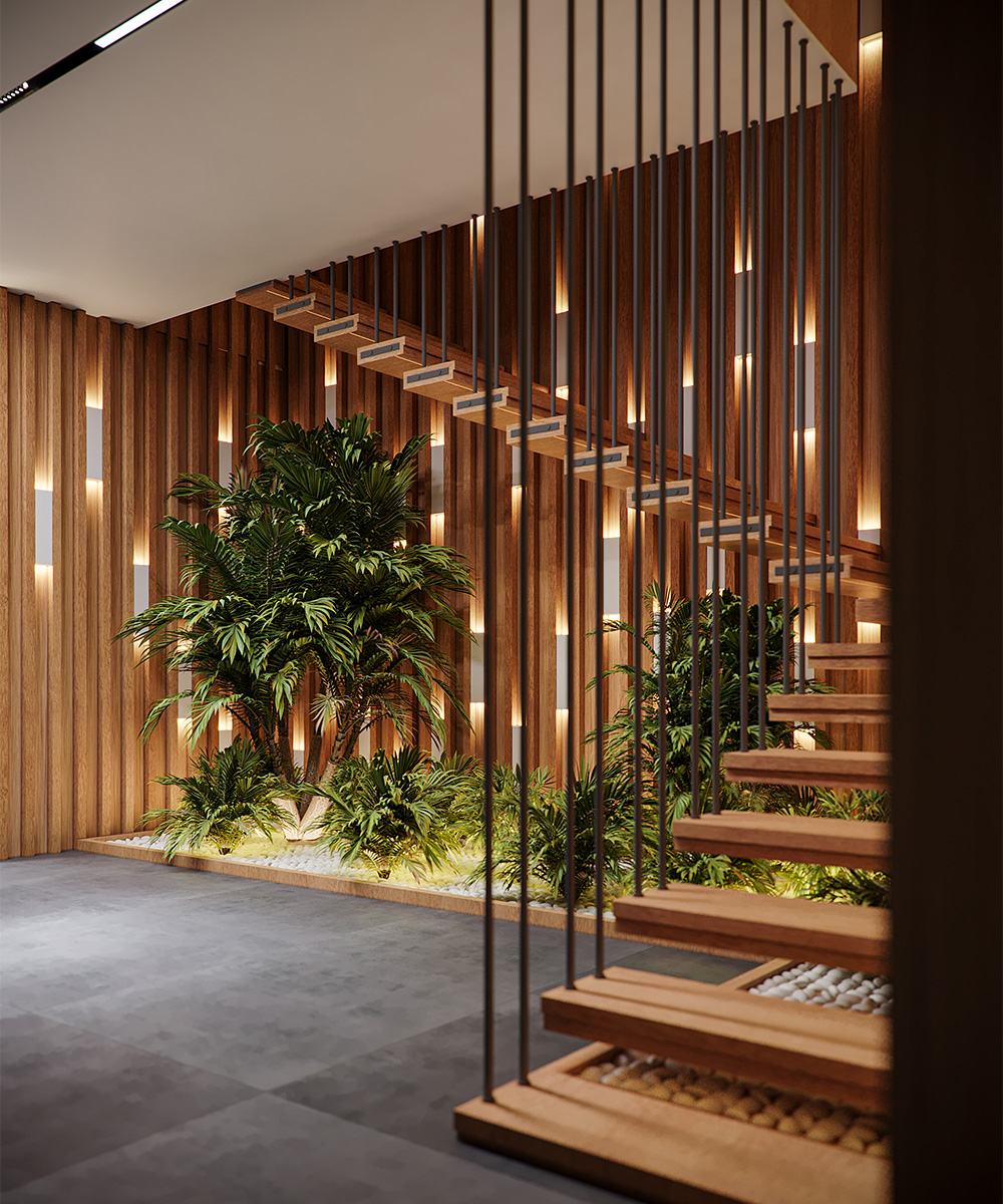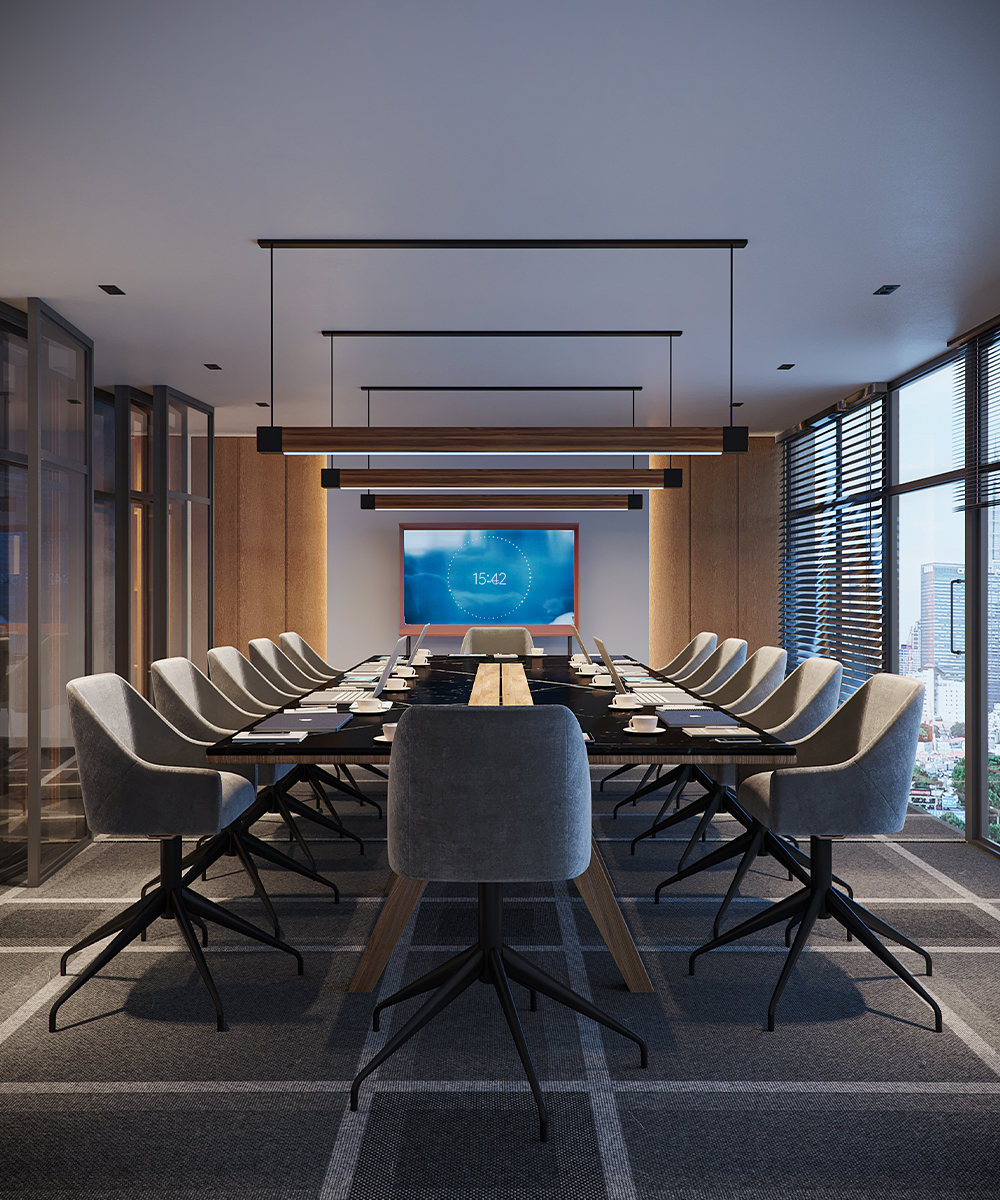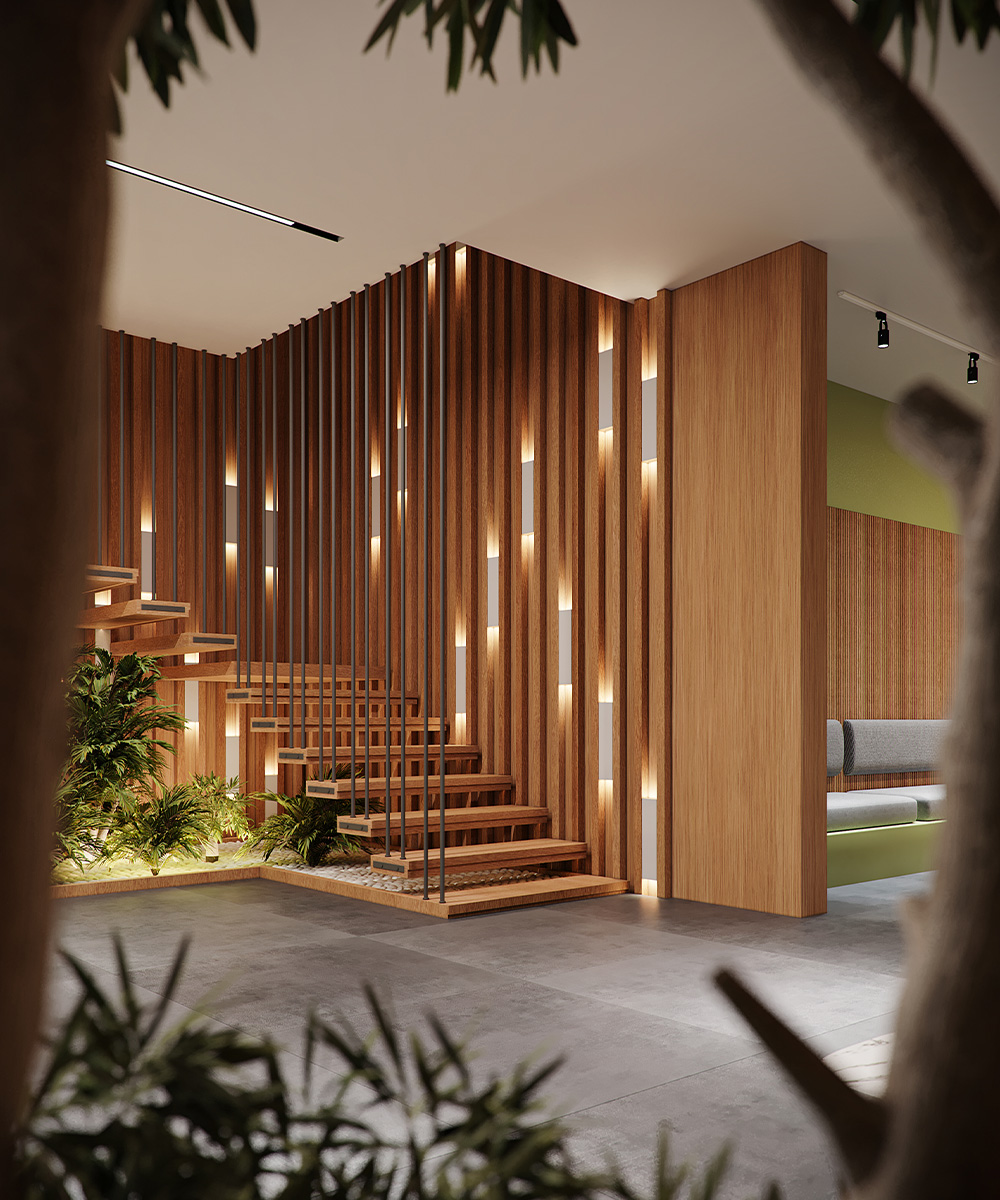 SCHNEIDER Contemporary staircase with wooden slats, integrated lighting, and lush indoor greenery. Sophisticated boardroom featuring a long wooden table, upholstered chairs, and advanced presentation technology.Type AdministrativeScope InteriorArea 1500 m²Year 2019Locations Maadi Previous Next Real Shots